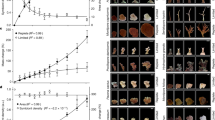 During the 22-d experiment, photochemical efficiency was measured every 5 d on dark acclimated (20 min) fragments between 20:00 and 22:00 using an Imaging-PAM fluorometer (Waltz). Fragments were dark-acclimated for 20 min and rapid light curves were generated (RLC, 0-701 μmol m−2 s−1 PAR, 20 s intervals), using an Imaging-PAM fluorometer (MI3, SI 10, gain 2, damp 2, saturating width 0.8 s; Heinz Walz GmbH, Effeltrich, Germany). Calculations for maximal photosynthetic yield (Fv/Fm) and maximum relative electron transport rates (rETRmax) were calculated according to Krueger et al.72. Coral skeletal (aragonite) growth measurements were taken every 7 d via the buoyant weight method73.