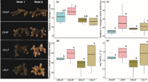After the experiment was completed, non-lyophilized subsamples of coral homogenate (90 μL) were fixed with paraformaldehyde to 4% and stored at 4 °C for symbiont density measurements. Symbiont density was determined with hemocytometer counts with a Zeiss Axioskop binocular microscope at 10–40x magnification (n = 8 per sample). Symbiont chlorophyll-a, -c2, and total chlorophyll concentrations were quantified spectrophotometrically after extraction in 1 ml of 90% acetone in the dark (24 h, 4 °C)74. The total soluble protein content of host and symbiont fractions were determined with the improved Bradford protocol, using bovine serum albumin as the protein standard75. Remaining airbrushed coral skeletons were then dried, cleaned of residual organic matter (10% bleach soak), and measured for surface area by wax dipping76 to facilitate normalization of physiological parameters to surface area.
