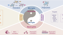 In this study, we have demonstrated that neutrophils nor CCR2-expressing monocytes are required for the development of hyperacute neuroinflammation following ischemic stroke. This is in agreeance with the previous negative clinical trials that tested interventions aimed at inhibiting leukocyte recruitment into the brain18,19,20. The hyperacute abundance of inflammatory cytokines observed in the present study, notably before the acute infiltration of peripheral immune cells, demonstrates that this recruitment is a consequence, rather than an initiator of neuroinflammation. We are yet to study the function of brain-infiltrating immune cells beyond 24 h in the PT model. However, learnings from other experimental models of stroke indicate that peripheral myeloid cells have neuro-protective function in the later stages of the response, via promotion of the resolution of neuroinflammation. It was demonstrated that neutrophils extravasate and interact with microglia in the cerebral infarct and surrounding tissue61,62. Microglia actively phagocytose both live and dead extravasated neutrophils in the stroke infarct core63,64,65, subsequently promoting the resolution of inflammation. It is unclear whether the resultant resolution of inflammation is a result of the neutrophil clearance or if microglia need to phagocytose neutrophils to re-polarize and return to their homeostatic, pro-resolving state. The interplay between microglia and neutrophils, and their potential resolving function, may explain why targeting the infiltration of peripheral immune cells into the brain failed to benefit patients after stroke.