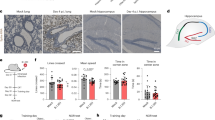 We determined social behavior (social approach and social novelty) in three sessions, as we previously described79. The arena (60 cm long, 40 cm wide, and 22 cm high) was divided into three identical chambers with transparent walls, and each side chamber equipped with a clear plexiglass cylinder (7.5 cm diameter) bearing several holes to allow nose contact. During the habitation session, the mouse was allowed to explore freely for 5 min. The mouse was then gently transferred to the middle chamber, and the doorways were closed. In the social approach session, the first stranger mouse (stranger 1, C57BL/6 of a different sex) was placed in one of the side chamber cylinders. After opening the doorways, the test mouse was allowed to explore Stranger 1 or the empty cylinder for another 10 min. In the social novelty session, a second stranger C57BL/6 mouse (stranger 2) was placed in the empty cylinder, and the test mouse was allowed to explore the arena, and the two stranger mice for 10 min. Time spent sniffing the mouse inside of the cylinder was recorded with TopScanTM 2.0 (n = 8–12 per group).