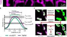 The IBM association factor of TMRM was calculated as described elsewhere34. In short, images were subjected to background subtraction (Mosaic Suite, background subtractor, NIH) with a sliding rectangle diameter of 50 pixel. The reference channel (MTG, TMRM) was Otsu42 auto thresholded and further dilated and eroded in two independent subsets. 1 erosion and 2 dilation iterations were used. Pixel-wise subtraction of the erosion reference of the dilated reference image yields in a hollow structure, used as a mask to measure the mean intensity in the mitochondrial periphery or IBM related area in the object channel. The erosion reference served as a mask to measure the bulk or cristae mean fluorescence intensity. The ratio of IBM/CM mean intensity is a value to estimate changes of the object label distribution inside a mitochondrion, which is referred to as the IBM association index. The higher the ratio value the higher the distribution of protein label in the IBM. For image analysis, the freeware program ImageJ was used43.