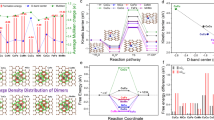 Heterogeneous catalytic reactions begin with the adsorption of the reaction substrates. In CWAO system of acetic acid, there are two important sections affecting the reaction rate, the adsorption and activation of reactants. To activate these two reaction substrates, the adsorption step must occur on the surface of the heterogeneous catalyst firstly. Based on the density functional theory (DFT), we calculated the adsorption energy (ΔEad) of O2 and acetic acid on different catalyst model (Fig. 5 and Supplementary Table 3). And it’s necessary to state the model here using Ru cluster is different from Ru NP we observed in TEM and may have some limitation on the following analysis, but the models still can represent some interaction between the support and active metal Ru. And the computational results show that the metal heteroatom Ni anchored into the nanotube will decrease the ΔEad towards the substrates, especially O2 (ΔEad-O2: from 1.23 eV to −0.06 eV), while the cluster on the CNT possess higher adsorption energy that adsorbs the substrates more easily (Fig. 5b, g, c, h and Supplementary Fig. 13a, b, g, h). That explained the low catalytic activity of Ni-NCNT/AC towards CWAO of acetic acid compared with Ru cluster outer of the nanotube. the CO-diffuse reflectance infrared Fourier transform spectroscopy (CO-DRIFTS) also proved that anchored Ni in Ni-NCNT/AC has low adsorption ability (Supplementary Fig. 14). The noble metal Ru cluster intrinsically possess a high affinity for adsorbing and activating O2 and acetic acid (Fig. 5b, g). Ru single-atom anchoring into the NCNT dramatically increased the ΔEad for O2 and acetic acid which represents a charge redistribution (Supplementary Fig. 13a, b), while atom in Ru cluster will possess a better adsorption for O2 and acetic acid (Fig. 5b, g). Thus, loading NPs on the support will be better for adsorbing O2 and acetic acid. However, the strong bonded oxygen adsorbed on the NPs surface will poison the metal surface. Thus, the proper adsorption on the Ru cluster surface is vital important for catalytic oxidation reaction, especially at high-temperature and high-pressure condition. The Ru cluster on Ni-NCNT (−2.0 eV) show a very similar adsorption on O2 than that of Ru cluster on NCNT (−2.07 eV), while the affinity for acetic acid improved a lot for Ru cluster on Ni-NCNT compared with the Ru cluster on NCNT (Fig. 5d, e, i, j). From the computational result, it is confirmed that the modulation through doping single-atom Ni into NCNT makes the interaction between Ru cluster and support towards better adsorption state that is benefit for the catalytic reaction. Anchoring of metal atom can redistribute the charge of metal atom and the surrounding atoms and modified the property of base-materials16. The different adsorption configuration for acetic acid (Fig. 5g, i, j) has proved that single-atom Ni in Ni–NCNT redistribute the outer electron, affecting the surrounding atom to have a new electronic structure and further alters the material’s electronegativity and promote the activity of Ru cluster17.the reason of the adsorption for O2 was less affected by introducing Ni single-atom may be that the new electronic structure was not suitable for O2 to form Ru–O bond. Therefore, loading noble metal nanoparticle on this transition metal atom anchored support is a facile and reliable strategy for improving the catalytic activity.