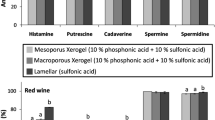 The analytical procedure is based on the method developed by Franc et al.30. The extraction of compounds was carried out using 10 mm × 1 mm (length × film thickness) polydimethylsiloxane stir bars (Twister®, 63 µL coating, Gerstel, Mülheim an der Ruhr, Germany). These were placed into the vial containing 10 mL of wine sample and 20 µL of an internal standard solution (hydro alcoholic solution 50% v/v at 112 µg L−1 of d3-2-isobutyl-3-methoxypyrazine, 55.5 µg.L−1 of d5-2,4,6-trichloroanisole 60 µg L−1 of d5-4-ethylguaiacol and 300 µg./L−1 of (±)-d5-geosmin). After 60 min of stirring at 900 rpm, the stir bars were removed, rinsed with Milli-Q quality water (18.2 MΩ cm−1), dried carefully with a paper towel, and transferred into a desorption tube for chromatographic analysis. Analyses were performed using an Agilent 6890 gas chromatograph system, fit with an Agilent HP-5MS capillary column (30 m × 0.25 mm i.d. 0.25 µm film thickness). The GC was combined into an Agilent 5975 mass spectrometric detector (Agilent Technologies, Massy, France). The system was equipped with a Gerstel MPS 2 autosampler, a Twister Thermal Desorption Unit (TDU), and a Gerstel Cooled Injection System Programmable Temperature Vaporization (PTV) inlet (Gerstel, Mülheim an der Ruhr, Germany).The compounds adsorbed on stir bars were thermally desorbed in the TDU with a helium flow at 50 mL min−1 in splitless mode and a temperature rate program of 60 °C.min−1 from 30 °C to 280 °C (held for 10 min). TDU transfer line was kept at 300 °C and the desorbed compounds were cryofocused in the CIS maintained at −100 °C using liquid nitrogen. PTV injector was then heated at 12 °C.s−1 from −100 °C to 290 °C (held for 5 min) to inject the trapped compounds onto the capillary column. The injection was performed in splitless mode at 1.5 min (helium purge flow of 50 mL.min−1). The program for the oven temperature was as follows: 40 °C for initial temperature, increasing to 120 °C at a rate of 2 °C min−1 and then to 290 °C (held for 9 min) at a rate of 10 °C min−1. Electronic ionization was performed at 70 eV with a detector temperature at 230 °C. The selected ions monitored with a dwell time of 50 ms and distributed in time windows were the following: Window 1—after solvent delay (15 min) to 30.5 min, ions 122, 124, 137, 139, 152, 157; Window 2 - From 30.5 to 34.5 min, ions 195, 197, 210, 212, 215, 217; Window 3 - From 34.5 to 39 min, ions 112, 114, 128, 149, 182, 186; Window 4—From 39 to 43 min, ions 231, 244, 246; Window 5—From 43 to 46 min, ions 265, 278, 280, 329, 331, 346. Run time was 66 min. The method allows the quantification of: 2-Isobutyl-3-methoxypyrazine (IBMP); 2,4,6-trichloroanisole (TCA); 2,4,6-tribromoanisole; 2,3,5,6-tetrachloroanisole; 2,3,4,5,6-pentachloroanisole; 4-ethylphenol (EP); 4-ethylguaiacol (EG); (±)-geosmin. Only, IBMP (in 2 samples at the levels of 4 and 17 ng L−1), EP and EG (in all the samples but 3 at levels between 8 and 7000 µg L−1) have been detected and quantified.