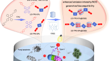 The presence of the AzoDiGua in the aggregates led us to explore whether photoluminescent properties could be acquired by these assemblies through the aggregation-induced fluorescence mechanism of azobenzene52,53,54,55,56,57. Using fluorescence spectroscopy, we found that ATP/AzoDiGua aggregates were broadly absorbing in the range 320–460 nm, displaying a reproducible photoluminescent emission regardless of the excitation wavelength (Supplementary Fig. 6) with a maximum at around 650 nm (Fig. 2A). Notably, neither ATP nor AzoDiGua alone was significantly absorbing for a photoluminescent emission at 650 nm (Supplementary Fig. 7) nor photoluminescent when excited at 400 nm (Fig. 2A, Supplementary Fig. 8). Moreover, the same system prepared with ADP or AMP, instead of ATP, displayed weak photoluminescence for ADP/AzoDiGua where small aggregates formed, and no detectable signal for AMP/AzoDiGua where no assembly was observed (Supplementary Fig. 9). All these results show that the self-assembly between ATP and AzoDiGua was instrumental in the emergence of the photoluminescence from the ATP/AzoDiGua suspension. It was shown in the past that restricting the conformation of AzoDiGua in a co-assembled crystal hindered its rotation/inversion relaxation upon photoexcitation leading to a neat enhancement of fluorescence50, with excitation/emission properties similar to that obtained in the ATP/AzoDiGua system. We thus ascribed the photoluminescence of the ATP/AzoDiGua assemblies to a similar aggregation-induced fluorescence mechanism leading to enhanced fluorescence of AzoDiGua when engaged in the supramolecular aggregates. Fluorescence microscopy (Fig. 2B) confirmed that the fluorescence emission was mainly localized at the position of the micrometer-sized ATP/AzoDiGua aggregates. Therefore, ATP and AzoDiGua self-assembled to form fluorescent aggregates while their individual components, AzoDiGua and ATP alone, were not intrinsically fluorescent in solution. We then studied how different stimuli could dynamically control the assembly and therefore affect its aggregation-induced fluorescence properties.