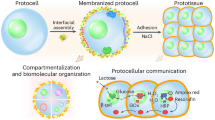 While the previous examples explore the behaviour of fibrillar networks in discrete compartments, one key aspect of biological cells is their ability to associate in complex scaffolds and tissues90. In this line, nucleic acid nanotechnology was exploited by Arulkumaran et al. to develop functional fibre assemblies confined within giant unilamellar vesicles (Fig. 4iii)91. The size and morphology of the assemblies could be controlled by electrostatic condensation, ranging from flexible nanotubes to rigid hierarchical fibres based on counterion concentration (i.e., Mg2+). The system responded differently to changes in osmotic stress: while the nanotubes were barely affected by high glucose concentrations, the higher-order fibres disassembled at high osmolarity. DNA anchoring pendants allowed the complementary association of filaments by incorporating cholesterol-functionalised fibres that adsorb into the internal membrane leaflet. This strategy was exploited to wrap DNA fibres at the outer part of the vesicle membrane, mimicking the exoskeletal structures observed in certain living organisms92. Importantly, the interactions between external frameworks could be exploited to control the organisation of the protocells and promote association into communities and prototissues. Although the formation of coacervate-based prototissues has been reported93, lipid boundaries are yet to be interconnected through fibrillar bridges while retaining structural integrity. Being membrane-less compartments, coacervates allow inter-droplet connection through fibres without breaking a lipid-aqueous interphase55. Such fibrillar connectors between droplets could mediate chemical information exchange across the protocell community as a mimic of a natural endocrine system81.