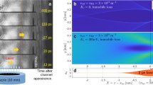 To model the seed ionisation scheme, a neutral hydrogen gas was initialised across the entire simulated volume. A field ionisation model was used to initialise the free electrons at the appropriate time within the simulation. The electrons were initialised with temperature 50 eV and uniform density 1019 cm−3. The laser pulses were initialised as ideal Gaussian beams. The long-pump pulse had a constant wavelength 1.054 μm and on-axis amplitude that decreased as α0 ∝ 1/\(\sqrt {t - t_{\mathrm {f}}}\) outside of the Rayleigh range, such that a = \(\left( {t - t_{\mathrm {f}}} \right)\alpha _0^2\sqrt {\omega _0\omega _{\mathrm {p}}{\mathrm{/}}8}\) = 0.08. The focal beam waist was 6 μm.