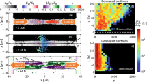 The laser pulse is linear polarized and propagates along the x-direction. It’s focused on the target with the peak intensity of 3 × 1023 W cm−2. The pulse has a Gaussian temporal profile with a duration (full width at half maximum (FWHM)) of τ = 15 fs of the field amplitude and a transversely Gaussian distribution a = a0exp(−r2/σ2), where \(\sigma = r_0{\mathrm{/}}\left( {2\sqrt {\rm ln2} } \right)\). It is cut at 2 × τ from the peak intensity, which means the peak intensity locates at x = −2cτ at t = 0. The cut-off intensity is ~1014 W cm−2. The dimensionless amplitude of the laser pulse is a0 = eE0/meω0c ≈ 468, where ω0 is the laser frequency, e and me are the electron charge and mass, respectively; and c is the speed of light in vacuum. \(E_0 = \sqrt {8\pi I_0{\mathrm{/}}c}\) is the laser electric field strength. The focus spot size (FWHM) of the laser is r0 = 3 λ, where λ = 1 μm is the laser wavelength. The laser radiation interacts with a double-layer target. The first layer consists of a hydrogen plasma with the peak density of n0 = 4nc, where nc = meω2/4πe2 is the plasma critical density. Its thickness is 22λ. The second layer is at the end of the hydrogen plasma target. It is a pre-ionized gold layer (Au51+) with the density of 600nc and of the thickness of 1λ. The details of the simulations and the code information are presented in the Methods.