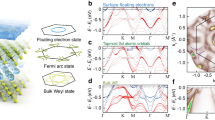 The analyzed \(G_{{\mathrm{surf}}}^{2{\mathrm{D}}}\) for Group A and B is plotted as a function of temperature in Fig. 4a. The \(G_{{\mathrm{surf}}}^{2{\mathrm{D}}}\) increases with decreasing temperature in WSM phase for both Groups. The steep increase of \(G_{{\mathrm{surf}}}^{2{\mathrm{D}}}\) for Group A induces the large σxx of the films in Group A. Judging from the consistent trend between the σxx shown in Fig. 3 and the \(G_{{\mathrm{surf}}}^{2{\mathrm{D}}}\) in Fig. 4a, the difference between the observed σxx (black line) and the analyzed \(\sigma _{{\mathrm{bulk}}}^{3{\mathrm{D}}}\) (red circles) in Fig. 3; \(\sigma _{xx} - \sigma _{{\mathrm{bulk}}}^{3{\mathrm{D}}} = \sigma _{{\mathrm{surf}}}^{3{\mathrm{D}}}\), corresponds to the contribution of 2D \(G_{{\mathrm{surf}}}^{2{\mathrm{D}}}\). Considering the units of \(\sigma _{{\mathrm{surf}}}^{3{\mathrm{D}}}\) and \(G_{{\mathrm{surf}}}^{2{\mathrm{D}}}\), we estimate the effective thickness of the surface conduction \(t_{{\mathrm{surf}}}^{{\mathrm{eff}}}\) by a following equation \(\sigma _{{\mathrm{surf}}}^{3{\mathrm{D}}} \times t_{{\mathrm{surf}}}^{{\mathrm{eff}}} \times 2 = G_{{\mathrm{surf}}}^{2{\mathrm{D}}}\) where the factor of 2 corresponds to two surfaces of the films. Although the error bar is large in Fig. 4b, the t-independent 2D conduction region is estimated to be roughly 20 nm constant against t-variation. This value is rather thicker than that of 3D-TI for example 5 nm of Bi2Se3 (ref. 15). The distribution of surface Fermi arc along z-direction may be related to the broadness of the projection of Weyl nodes with narrow gap17. Based on empirical facts that weakening of spin–orbit coupling tends to increase the critical thickness in 3D-TIs such as Bi2Se3 and Bi2Te3 (refs. 15,16,17), the weaker spin–orbit coupling of Co3Sn2S2 composed of lighter elements may induce the weak confinement of surface state, resulting in the large effective thickness. While we here assume uniform \(G_{{\mathrm{surf}}}^{2{\mathrm{D}}}\) to estimate the averaged effective thickness, the penetration function of the surface conduction region should be more carefully considered to be rapid decay along z-direction as like 3D-TIs17,30. It will be important to clarify the correspondence between the estimated \(t_{{\mathrm{surf}}}^{{\mathrm{eff}}}\) and the real-space distribution of the surface states. While the values of \(\sigma _{{\mathrm{bulk}}}^{3{\mathrm{D}}}\) and \(G_{{\mathrm{surf}}}^{2{\mathrm{D}}}\) are influenced by the defects in bulk and surface region, the \(t_{{\mathrm{surf}}}^{{\mathrm{eff}}}\) is likely valid owing to the independent analysis for the estimation of bulk and surface contribution. In this study, apparent detection of the t-independent conductance reveals the possibility of surface Fermi arc conduction in the Co3Sn2S2 thin films.