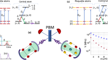 The main sources of errors in quantifying the Ck-NOT gate’s operation are spontaneous emission of the atomic levels, and population rotation errors. The spontaneous emission from the Rydberg level only occurs in the qubit configuration \(\vert {0}_{c}^{k}{1}_{t}\rangle\) where the single target atom gets excited to the Rydberg state. Hence the averaged operation error of \({E}_{sp,r}=\frac{1}{{2}^{k+1}}\frac{\pi }{{{{\Omega }}}_{{{{{{{{\rm{r}}}}}}}}}}{{{\Gamma }}}_{r}\) is expected. Off-resonant Rydberg excitation results in blockade leakage adding up to the average error of \({E}_{r1}=\frac{1}{{2}^{k+1}}{\sum }_{j=1}^{k}\big(\begin{array}{c}k\\ j\end{array}\big)\frac{{{{\Omega }}}_{r}^{2}}{4{j}^{2}{U}_{RF}^{2}}\), where j is the number of control atoms in \(\vert {1}_{c}\rangle\) qubit-dependent lattice. In the two-photon excitation, the blockade is sensitive to the locking bandwidth of the lasers, which could be made less than 1kHz93. Also in the case of fast operation, the large frequency bandwidth of exciting pulses might affect the blockade at the heart of the scheme. Circle signs in Fig. 4 quantify the operation of the gate by simulating the master equation encountering the spontaneous emission from intermediate and Rydberg levels as well as the de-phasing terms associated with lasers’ line-width. Also, the frequency profiles of the laser pulses are encountered in the lasers’ detuning and Rabi frequencies as discussed in Methods. The analytic and numeric simulations of Fig. 4 suggest high fidelity operations of 99.8% could be expected in the setup of Fig. 1d. Other avenues in enhancing the fidelity are discussed in Methods, which are based on improving the interaction-to-loss ratio by using the resonance scattering in Cs atoms or exciting higher orbital angular momentum quantum numbers.