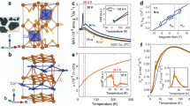 Bulk Mn3Sn, shown in Fig. 1a, crystallizes in a layered hexagonal lattice with space group, P63/mmc, in which Mn atoms form a magnetic kagome layer, see Fig. 1b–d. Each two-dimensional (2D) kagome geometry formed by Mn atoms contains Sn atom at the center of the hexagon of Mn. The following discussions are based on the ab initio results calculated with experimental lattice parameters, a = b = 5.65 Å, and c = 4.522 Å58. The “direct” triangular AFM state in Fig. 1(b) is distinguished by the handedness of the spin rotations: a counterclockwise 120° rotation turns the spin S1 in one atom into S2 in the neighboring atom. The “inverse” triangular AFM texture in Fig. 1(c) on the other hand is the result of clockwise 120o rotation while moving from S1 to S2. One easy way to switch κ from ‘ + 1’ to ‘ − 1’ is by a staggered rotation of any two spins while keeping the third one unaltered in the unit cell. Here, the staggered rotation means a simultaneous counterclockwise and clockwise rotation of the in-plane spins, e.g. S1 and S2, respectively with respect to the z-axis as depicted in the small square box in Fig. 1. By doing so, the \({{{{{{{{\mathcal{C}}}}}}}}}_{3z}\) rotational symmetry, a special symmetry that is protected in κ = + 1 state is broken. In our magnetic calculations without spin orbit coupling (SOC), both noncollinear states are equivalent; i.e., they are degenerate in total energies. The calculated magnetic moment of each Mn atom is about 3.12μB, confined in the xy-plane. These two magnetic states become inequivalent when SOC is switched on and the coplanar κ = − 1 AFM state is found to be the ground state. The stability energy with respect to the competing κ = + 1 state is found to be very small, about 4.5meV/f. u. Moreover, the calculated energy difference as a function of staggered rotation is found to exhibit two inequivalent minima corresponding to the κ = + 1 and − 1 states (see Supplementary Fig. 1 and Supplementary Note 1). This indeed corroborates the breaking of vector chiral symmetry in the presence of SOC.