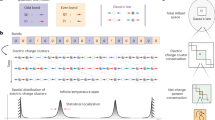 The spin Hamiltonian in Eq. (3) retains the original symmetries of the LGT. The Coulomb and disorder terms in the Hamiltonian are purely diagonal, whereas the purely off-diagonal term \({\hat{H}}_{\pm }\) creates and annihilates electron-positron pairs, thus conserving the total particle number. In the spin language, the Hamiltonian conserves the total magnetization \({\sum }_{i = 1}^{N}{\hat{\sigma }}_{i}^{z}\) corresponding to a U(1) symmetry. This is expected as the original continuum theory, QED in 1 + 1D has a U(1) gauge symmetry. We resolve this symmetry by working in the sector with zero magnetization, or equivalently the half-filling sector of fermions, which has a Hilbert space dimension of \(\left(\begin{array}{c}N\\ N/2\end{array}\right)\). In this sector, the model can have further symmetry corresponding to charge conjugation and spatial reflection113. However, because of the presence of background charges in \({\hat{H}}_{q}\), this is only a symmetry if the background charges {qα} themselves are symmetric under charge conjugation and reflection. For example, this is a symmetry when all background charges are set to zero. For randomly picked charge distributions, however, this is almost never the case and can be ignored.