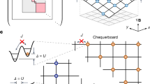 The full state of the system encodes the degrees of freedom of both fermions and gauge fields: it is spanned by tensor products, \({| \Psi \left.\right\rangle }_{0}={| \Psi \left.\right\rangle }_{f}\otimes {| \Psi \left.\right\rangle }_{g}\), where \({| \Psi \left.\right\rangle }_{f/g}\) is the state of the fermions/gauge fields. For the fermions, we focus on the vacuum state or the Néel state of fermions, \({| \Psi \left.\right\rangle }_{f}=| 101010\ldots \left.\right\rangle \equiv {| {\mbox{vac}}\left.\right\rangle }_{f}\), while other choices of fermionic states are discussed in Supplementary Note 3. For \({| \Psi \left.\right\rangle }_{g}\), following Brenes et al.56, we consider a uniform superposition of three eigenstates of the electric field operators – see Methods. Due to the constraint between the gauge fields \({\hat{L}}_{n}\) and the background charges qn, our initial state therefore effectively encodes a superposition over the charge sectors.