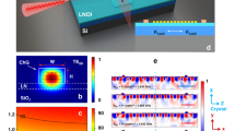 The most basic χ(2)-based optical frequency mixers in TFLN rely on a rib waveguide oriented orthogonal to the material’s crystallographic z-axis (Fig. 1a). For efficient parametric three-wave mixing to occur in the device, the vacuum wavelengths, λi, and effective propagation constants, ki = 2πneff,i/λi (i ∈ {1, 2, 3}) (where neff,i is the effective index for λi), of the three interacting guided modes must satisfy energy conservation, \({\lambda }_{3}^{-1}={\lambda }_{1}^{-1}+{\lambda }_{2}^{-1}\), and momentum conservation, Δk ≡ k1 + k2 − k3 = 0. The latter condition is also known as “phase matching” and is not, in general, satisfied for most processes due to the material and modal dispersion of the waveguide modes of interest. However, in LN—and other ferroelectric materials—a nonlinear three-wave mixing process can be “quasi-phase matched” by periodically flipping the sign of the second order coefficient, χ(2), with period, Λ(nLN, t, w, d, θ) = 2π/(Δk(nLN, t, w, d, θ))30. The grating period depends on material indices of LN (buried oxide) layer at the wavelengths of interest, \({n}_{{{{\rm{LN}}}}({{{{\rm{SiO}}}}}_{2})}\); TFLN thickness, t; waveguide rib height, d; waveguide top width, w; and sidewall angle, θ (Fig. 1a). In x-cut TFLN, which is the crystal orientation of choice for compatibility with high-performance electro-optic devices, the QPM grating is typically fabricated by applying a strong electric field along the crystallographic −z direction using coplanar finger electrode gratings with a period that matches the desired QPM grating period (Fig. 1b, inset); this is known as “ferroelectric poling”31. This creates a QPM grating with spatial frequency, K = 2π/Λ, along the direction of propagation to compensate for the phase mismatch.
