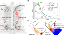 This behaviour agrees with SOLPS-ITER predictions35 of the CD, ED and SXD configurations (Fig. 5a–c). The CD simulation is attached, whereas the SXD and ED simulations are detached. The radius of both the D2 Fulcher emission front as well as the 5 eV contour, for the ED and SXD, remains near r = 0.95 m. The D2 Fulcher emission near the X-point region is also in agreement between experiments (Fig. 6), suggesting that the strong neutral trapping obtained in the simulations is consistent with the experiment. However, the simulations feature an attached inner target (Fig. 6a–c) with strong D2 Fulcher emission near the inner strike point (Fig. 6d–f), which is not observed experimentally (Fig. 6g–i). This suggests the inner target power loading is negligible in the experiments and overestimated in SOLPS-ITER simulations. This requires further study including using multi-diagnostic, Bayesian, to infer plasma parameters outside the divertor chamber analysis techniques59.