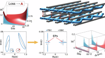 where \(\alpha ={e}^{-\frac{i\pi t}{2}}\). In a Floquet context, this equation is valid at periodic time intervals t = kT, with \(k\in {\mathbb{N}}\). Equation (11) provides confirmation of the results of Fig. 2, as the polynomial growth factors match precisely with those of the analytically calculated stroboscopic evolution operator. While the system’s response was demonstrated precisely at the EPs, as a unique case of interest, the dynamics unfolding in either the broken or unbroken \({{{\mathscr{PT}}}}\)-symmetric regimes of Fig. 1c, d, are also confirmed to exhibit the characteristic behavior associated with the NHSE. In addition to the stroboscopic visualization of the field amplitude, Fig. 2f presents the dynamic behavior of the system as a function of continuous time for various initial conditions. During each Floquet period, the field oscillates between the elements of the lattice, ultimately exhibiting a corresponding polynomial growth over time. The isotropic nature of the model becomes evident. In other words, despite the apparent non-reciprocal nature of the transmission operator U in Eq. (11), the non-stroboscopic dynamics unfold in an isotropic manner, in contrast to purely non-reciprocal systems that rely on anisotropic couplings to induce NHSE EPs.