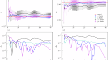 To test the ETH, we first look at the diagonal part of the observable expressed in the energy eigenbasis. We verify that the expectation values \(\left\langle {E}_{\alpha }\right\vert {{{\mathcal{O}}}}\left\vert {E}_{\alpha }\right\rangle\) depend smoothly on the energy Eα. Therefore, we can define the microcanonical value for a certain energy Eα as \({\langle {{{\mathcal{O}}}}\rangle }_{{{{\rm{mc}}}}}({E}_{\alpha })=\frac{1}{21} {\sum }_{\beta = \alpha -10}^{\alpha +10}\left\langle \beta \right\vert {{{\mathcal{O}}}}\left\vert \beta \right\rangle\). With this we can calculate the deviation of a diagonal matrix element from the microcanonical value \({\Delta }_{i}(\alpha )=\left\langle \alpha \right\vert {O}_{i}\left\vert \alpha \right\rangle -{\left\langle {{{\mathcal{O}}}}\right\rangle }_{{{{\rm{mc}}}}}({E}_{\alpha })\), take the mean over such fluctuations at different energies (except the edges of the spectrum) and compare results from different system sizes. According to the ETH ansatz, this quantity should be proportional to the factor e−S(E)/2, which vanishes exponentially in the thermodynamic limit. In Fig. 2, this analysis is carried out for the one- and two-plaquette Wilson loop operators on the honeycomb lattice64. It can be clearly seen that the fluctuations in the thermodynamic limit approach zero exponentially, as expected.