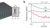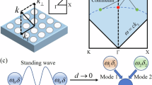 To state the construction of FW BICs, we extend the temporal coupled-mode theory54 in optics, which is applicable to general frameworks for resonators coupled with multiple input and output ports. Temporarily ignoring the waveguide \({{{\rm{p}}}}_{3}\), the metamaterial in Fig. 1a simplifies to a model featuring periodically bilateral pillars at its edge. The pillar thickness is in deep-subwavelength scale for all interested frequency, so that only fundamental mode is considered. Then, for incident flexural waves, when ignoring the structural loss, each-side pillar can be described by the temporal coupled-mode equation (sketch shown in Fig. 1e) for the lowest mode with the amplitude \({\tilde{a}}_{1(2)}={a}_{1(2)}{{{\rm{e}}}}^{{{\rm{i}}}\omega t}\) as1