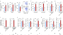 Tumours were collected from killed mice on day 18 post-tumour inoculation. Isolated tumours were incubated in collagenase type I (Gibco) and DNase (Roche) in RPMI for 30 min at 37 °C. Tumour mixtures and spleens were dissociated through a 70-µm filter and washed with PBS. Tumour suspensions were pelleted and resuspended in 40% Percoll solution, underlaid with 80% Percoll in a 15-ml conical flask. After centrifugation at 2,000g for 30 min, the middle layer was removed, washed in PBS and counted. For in vitro stimulation assays, approximately 1 × 106 cells per well in a 96-well plate were stimulated in the presence of GolgiStop (BD Bioscience) for 4 h at 37 °C with PMA (50 ng ml−1) and ionomycin (500 ng ml−1).