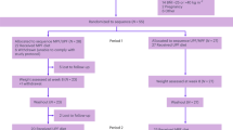 To determine gastric emptying, a 13C-gastric emptying breath test (13C-GEBT) was conducted on day 6 following a standardized isocaloric test meal (porridge, 25% of individual REE) labelled with 100 mg 13C-sodium acetate (Hanseaten Apotheke). The test meal had to be ingested within 5–10 min and breath samples were collected in gas-tight, aluminized breath bags at baseline and 15, 30, 45, 60, 75, 90, 105, 120, 150, 180, 210 and 240 min postprandially. During sampling, participants remained sedentary and water consumption was limited to 1 l. To minimize potential intraindividual dilution effects, participants maintained a drinking protocol during the first test and repeated it during the second test. Breath samples were analysed in duplicate using a non-dispersive, isotope-selective infra-red isotope analyser (IRIS DOC 2, Kibion) no later than 1 week after breath sampling. Percentage 13C-dose recovery (PDR in % per hour) was calculated from delta values (o/oo) from which gastric half-emptying time (t1/2), gastric emptying lag time (tlag) and gastric emptying coefficient were calculated according to the method of Ghoos55 and as previously described by our group56.