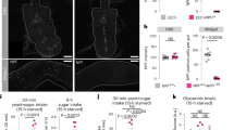In mammals, glucagon is released during periods of fasting and exercise that trigger the breakdown of energy stores and may lead to reduced blood sugar concentration. This function is mirrored by the role of AKH in insect energy store mobilisation. Interestingly, protein-rich foods can also trigger glucagon release55. Based on this, we hypothesized that Tk, released from EECs in response to protein intake, might stimulate APCs to release AKH. Supporting this notion, we observed reduced intracellular AKH levels in the APCs of animals that had consumed yeast compared to those of animals on a sugar diet (Fig. 5b). This depletion was not associated with changes in Akh transcript levels (Fig. 5c), suggesting that it can be attributed to increased secretion of the AKH peptide in yeast-fed animals. However, this effect was completely abrogated when TkR99D was knocked down in APCs using Akh-GAL4 (Akh>): yeast feeding did not lead to AKH depletion from APCs in these animals (Fig. 5b,c). Together, our data imply that food high in protein and low in carbohydrates triggers AKH secretion and that TkR99D in APCs is essential for this effect.