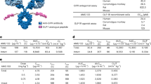 Superiority of the GIPR:GLP-1R co-agonist MAR709 to yield greater weight loss and further inhibition of food intake relative to GLP-1R agonism is diminished in mice with loss of Gipr in either the CNS15 or in GABAergic neurons14, indicating that GIPR agonism also contributes to weight loss induced by such a co-agonist. Notably, while long-acting GIPR agonists act in the brain in a GLP-1R-independent manner to decrease body weight and food intake via GABAergic GIPR neurons, GIPR antagonism also decreases body weight and food intake in DIO mice and non-human primates, particularly when used in co-therapy with GLP-1R agonism22,23,24,25,26,27,28. Thus, surprisingly, GIPR agonism and antagonism appear to have similar metabolic end points when it comes to body weight control. AMG133, a bispecific hybrid that comprises two GLP-1R agonists conjugated to a monoclonal anti-GIPR antagonist25,26 is currently in phase 2 clinical development for the treatment of obesity and type 2 diabetes. It shows superiority in decreasing body weight relative to targeting of each individual receptor in DIO mice and non-human primates25. In a recent phase 1 study, AMG133 induced more than 10% weight loss after 12 weeks of treatment in healthy humans26. Together, these findings support the notion that both GIPR agonism and antagonism hold therapeutic value to accelerate GLP-1-induced weight loss.