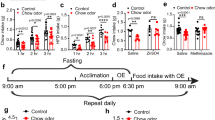 Five weeks after surgery, mice were either fasted overnight or random fed and placed in the olfactory stimulation chamber from 1 h to 5 h into the light cycle, where they were acclimatized to the connected pumps that inflated the chamber with ambient air for 10 min. After 5 min of exposure to an empty bottle (control), mice were exposed to the NCD odour for 1 min. This was followed by a 5-min exposure to the control to remove residual NCD odour. Mice were then exposed to the HFD odour to which they were naive, for 1 min, followed by a 5-min exposure to the control. Mice were exposed to small amounts of HFD in their home cage 6 weeks after surgery for 3 to 5 days to associate the smell of HFD with its caloric value. Mice were then fasted overnight and placed in the olfactory stimulation chamber during the light cycle. After a 10-min acclimatization period, the mice were exposed to the control for 5 min, followed by a 1-min exposure to HFD to which they were now non-naive. After a 5-min exposure to the control, mice were exposed to NCD for 1 min, followed by a final 5-min exposure to the control. One week later, overnight fasting was repeated, and recording was performed by exposing the mice to isoamyl acetate for 1 min. A separate cohort of NCD-fed mice were either fasted overnight or not fasted and exposed to non-food-related odours (mineral oil, limonene and geraniol) for 1 min as described above 5 weeks after surgery