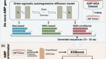 After the denoising network has been trained, it can be used to generate new AA sequences through an iterative denoising process. In this study, we first used the denoising network ϕθ to estimate the generative distribution \({\hat{p}}_{\theta }({\hat{{\bf{x}}}}_{0}^{i}| {{\bf{x}}}_{t}^{i})\) for each AA residue. Then the reverse denoising distribution \({p}_{\theta }({{\bf{x}}}_{t-1}^{i}| {{\bf{x}}}_{t}^{i})\) was parametrized by combining the posterior distribution with the marginalized network predictions as follows: