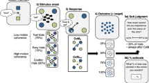 Figure 2c illustrates how the model adapts to spatial patterns when integrating motions. When a diamond moves along a circular path (scenario A), where stage I would detect local orthogonal movements of the line segments, stage II integrates the local motions into a coherent global motion (see the left side of Fig. 2c). In scenario B, despite the corners of the diamond being occluded by stationary rounded squares, the model integrates the local motions of the line segments into a single coherent motion. The heat map of the stage II connections shows that the line segments remain linked, as if the model properly considers the spatial relationships between occluders and edge segments. This cannot be simply attributed to a wide integration window from the motion graph because, in scenario C, where the occluders are invisible, the connections between the line segments are lost in stage II, and the model generates incoherent motion. These model behaviours across scenarios A–C align well with human psychophysical data34, as shown by the similarity in the motion coherence index between the model and humans (see bar plot at the bottom-left of Fig. 2c).