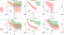 We tested the prognostic significance of patient age, pathological stage, RD status after debulking surgery, NACT-IDS versus PDS treatment paradigm, receipt of PARP inhibitors in the first 2 years after diagnosis and the presence or absence of adnexal lesions (Supplementary Table 6), ultimately training a model on RD status and PARP inhibitor administration. This model stratified the test set with Harrell’s concordance index, c = 0.51 (95% CI 0.493–0.528). We then implemented a late-fusion8 approach to integrate histopathological, radiomic, genomic and clinical data into multimodal models (Fig. 1e). Specifically, we predicted each patient’s log partial hazard using the Cox model trained using the respective modality, then trained a final Cox model to integrate them (Methods). In the test set, the model combining both imaging modalities (radiomic–histopathological (RH) model) significantly outperformed the HRD status-based model, clinical model and individual imaging models, with a test concordance index of 0.62 (95% CI 0.604–0.638) (Fig. 6a). The model with genomic, radiomic and histopathological (GRH) modalities performed comparably, with a test concordance index of 0.61 (95% CI 0.594–0.625). The histopathological submodel score remained significant upon addition of HRD status (Fig. 6b). The high- and low-risk groups established by the GRH model were significantly different by log-rank test in the training set (median survival of 34 and 50 months, respectively; P = 0.026; Fig. 6c). In the test set, the GRH risk groups also showed significantly different OS, with median survival of 30 months for the high-risk group and 50 months for the low-risk group (P = 0.023; Fig. 6d). At 36 months, 68% and 34% survived for low- and high-risk groups, respectively, in the test set. The separation of the RH model’s risk groups was inferior (Extended Data Fig. 7). Notably, analysis of only training cases with full information (n = 114) resulted in poor performance (Extended Data Fig. 8), reinforcing the ability of late-fusion models to learn in the setting of missing data. No robust association was found between modalities to enable interpolation of missing values (Extended Data Fig. 9).
