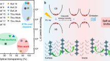 where I is the TL intensity, 3 is the number of deconvoluted peaks, n0i is the initial trap concentration, si is the frequency factor, Ei is the trap depth, kB is the Boltzmann constant, β is the heating rate, T is the temperature, and T0 is the initial temperature. The TL peaks of the undoped samples do not exhibit any appreciable fitting. For the other crystals, the TL peaks can be deconvoluted into three peaks and the parameters are listed in Supplementary Table 3. Figure 3b displays the concentration of three types of trap with different energy depths. It is clear that there are more traps at different energy depths with higher Li doping from 1:100 to 1:1. The total number of traps is comparable to the reported value from by photocurrent measurements (105 ~ 107 cm−3)3. Shallow traps (10.8 meV) are the major contribution to the total increase of traps induced by Li doping, while deep traps (124 meV) show a smaller contribution. The other difference is that small after-glow effects can be barely seen in undoped and 1:100 doped crystals, while they become more pronounced in 1:10 and 1:1 (Supplementary Fig. 7). We attribute this behavior to additional traps generated by Li doping. After these characterizations, we establish that Li serves as traps in the (PEA)2PbBr4 scintillation under X-ray irradiation and it may enhance performance while broadening the luminescence.