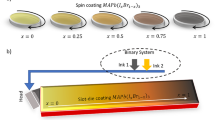 The organic halide, MX (MAI, MABr, FAI, FABr) salts were purchased from Greatcell Solar, PbI2 and PbBr2 from TCI. Fluorine doped tin oxide (FTO) substrates (NSG 10, Nippon sheet glass, Japan) were cleaned with a Hellmanex solution and afterwards rinsed with de-ionized water and ethanol. Then, they were treated with a UV/O3 cleaner for 15 min. A ~30 nm thick compact TiO2 layer was deposited via aerosol spray pyrolysis at 450 °C using a commercial titanium diisopropoxide bis(acetylacetonate) solution (75% in 2-propanol, Sigma-Aldrich) diluted in ethanol (Sigma-Aldrich) (1:9, volume ratio). A ~500 nm mesoporous TiO2 layer was deposited onto the TiO2 compact layer by spin-coating a solution of a diluted paste of 30 NRD (Greatcell Solar) in anhydrous ethanol (1: 3.5 weight ratio) at 5,000 r.p.m. for 20 s with a ramp-up of 2,000 r.p.m. The resulting films were annealed at 450 °C for 30 min under dry airflow41. 1.2 M lead halide, PbX2 (X: I-, Br- or Cl-) precursor solutions were prepared in N, N-dimethylformamide (DMF) (Sigma-Aldrich) by constant stirring at 100 °C for 15 min. Lead halide solutions were spin-coated onto the mesoporous TiO2 films at 6500 rpm for 30 s. Subsequently, the films were annealed at 80 °C for 15 min, after cooling to room temperature, the films were handled under inert conditions. After mounting on the stage, 200 µL of isopropanol solution of MX (50 mM) (M= MA, methylammonium (CH3NH3+) or FA for formamidinium ((NH2)2CH+) and X= I-, Br- or Cl-) was introduced onto the subsequent lead halide films using a Syringe pump.