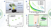 Subsequently, we determined the PersL duration of ELDs under various electrical field excitation conditions. First, varying stimulation times did not result in significant differences; here, we selected a stimulation period of 1 to 3 min (Supplementary Fig. 3). As illustrated in Fig. 3a, the attenuation duration significantly increased as the atmospheric temperature decreased, likely due to the greater retention of the shallow trap electrons at lower temperatures than at higher temperatures. Remarkably, the ELD decay time exceeded 600 s at temperatures below 300 K. In consideration of practical applications in low-temperature storage, we employed a storage temperature of 250 K for subsequent characterization of the targeted ELDs. Moreover, the performance of the PersL duration improved with increasing driving AC voltage and tended to saturate at 400 V (Fig. 3b). Notably, while PDMS facilitates powder dispersion and prevents short-circuiting, its effective insulating properties contribute to a PersL turn-on voltage exceeding 100 V. In parallel, elevated frequencies produce a surplus of hot electrons, amplifying the accumulation of electrons within trap states and thereby enhancing the PersL intensity. Nevertheless, the finite nature of the trap density needs to be highlighted since charging saturation was achieved at frequencies greater than 1 kHz (Fig. 3c). Simultaneously, elevated voltage and frequency potentially induce an increase in device temperature, accelerating the release of the charge carriers from traps and consequently minimizing the duration. The total AC waveforms used in Fig. 3b, c have been included in Supplementary Fig. 4. Hence, the AC voltage and frequency were set to 400 V and 1 kHz, respectively, in subsequent experiments. As depicted in Fig. 3d and Supplementary Movie 1, the PersL can be reliably reproduced under the recommended conditions (voltage = 400 V, frequency = 1 kHz, temperature = 250 K) even after undergoing multiple cycles of electrical charging. After charging at 250 K for 300 s, certain charge carriers persisted within the emission layer. Notably, they could be released at a heating rate of 150 K min−1 when the temperature is elevated (Fig. 3e and Supplementary Movie 2). These distinct TL signals provided supplementary evidence for the existence of traps with continuous depth distributions. The properties of electrical energy storage and photon release at 250 K are shown in Fig. 3f.