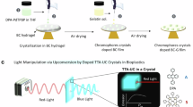 A balance of intermolecular interactions is required to produce ionogel films embedding immobilised, stable, and oriented LC droplets. This was better achieved with the C8 and C12 formulations. In these cases, the amphiphilic and surface-active character of the IL28,34 promotes the stable compartmentalisation of water-soluble and insoluble components of the gel, generating droplets that encapsulate the hydrophobic LC molecules, further immobilised in the ionogel gelatin matrix. Importantly, the long alkyl chains of the IL cation induce the homeotropic (or perpendicular) anchoring of the LC at the droplets interface33. This results in oriented LC droplets, with director profiles typically radial (exhibiting a Maltese cross pattern in POM and a central core defect visualised in BF) and escaped radial (showing a distorted Maltese cross with an off-centre defect) in C8 films (Fig. 4b, e). In the case of C12 films, radial and twisted radial droplets are observed (Fig. 4c, f). The twisted radial is a variant of the radial droplet with a small twist at the centre. This deformation occurs to reduce the core defect energy in radial droplets35. In general, in C12 films, the droplet colours are similar when sizes are similar, but we found some exceptions (for example, droplets between 14 µm and 22 µm in diameter can be either purple or orange (Supplementary Fig. S5a, b)). It is known that droplet configurations are affected by several factors, including boundary conditions, droplet size and shape33. Here, the different colours arise, probably, from the fact that the droplet population is not perfectly spherical, instead, spheroid and flat pancake-like shapes have been observed (Fig. 4l and Supplementary Fig. S5k), in accordance with our previous findings for similar gelatin ionogel matrices embedding 5CB droplets19. A third droplet profile is also observed, featuring a bright peripheral ring with short extinction bands that match the direction of the crossed polarisers and a central pseudo-isotropic region, which remains dark upon rotation (Fig. 4c and Supplementary Fig. S5h), while BF photos reveal a circular defect in some of the droplets (Fig. 4f and Supplementary Fig. S5i). Based on further investigations, we have concluded that the optical textures in BF are not a lensing effect, instead, these structures could be attributed to an axial director configuration with a disclination loop, probably close to the equator36,37,38. Here, the droplet pole, or axis, is perpendicular to the field of view39 (Fig. 4c, f and Supplementary Fig. S5g–i). An axial director profile can be observed in droplet systems with weak anchoring, which can decrease the energy of the structure by allowing a tilt in the LC alignment at the droplet interface35,36,40,41. We propose that the axial configuration arises from the fact that the C12mimCl IL provides sufficiently weak anchoring that facilitates this droplet organisation. For sufficiently weak anchoring energies, there are no defects in this structure, but for stronger anchoring conditions, an equatorial disclination can occur35,39. Raman mapping of the surface of the films showed a uniform distribution of the 5CB C ≡ N stretching vibration peak (2227 cm−1) at the surface of the axial droplet (Supplementary Fig. S5j), which is consistent with the perpendicular alignment of the 5CB molecules with the nitrile group facing the droplet interface, when the droplet pole is perpendicular to the field of view. For radial droplets, the Raman maps are totally different, showing a preferential distribution of the 5CB C≡N stretching vibration peak in two diametral opposite areas of the droplet surface spreading radially from the surface to the centre of the droplet (Supplementary Fig. S5f).