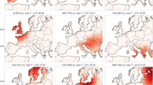 Figure 4b illustrates relevant fields for the land–atmosphere coupling on a larger spatial domain than the regional box over NE France/Belgium considered in Fig. 4a. The areas with significant soil dryness (dots) in the weeks preceding the July HW are in good spatial agreement with subsequent large sensible heat flux positive anomalies (shading) during the build-up of the July HW over NE France/Belgium. Collocated large anomalies of both fields extended over large areas, suggesting land–atmosphere coupling beyond NE France/Belgium, particularly to the south of the region hit by the July HW. This, along with the mean near-surface wind direction observed in the days preceding the July HW, suggests similar processes to those describing the concept of self-propagation21,22. Under the presence of southerly winds, dry air masses in central France warmed by anomalous sensible heat fluxes prior to the July HW were advected further north, likely enhancing remote land–atmosphere feedbacks and local sensible heat fluxes over the box displayed in Fig. 4b. This process arguably contributed to the amplification of the July HW. The circulation analogue exercise conducted further ahead supports these conclusions.