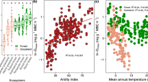 We obtained 268 data points (Supplementary Fig. 6 and Supplementary Table 2) from 64 articles that met the criteria for global analysis, and three unpublished grassland data points (near Longnan City, Gansu Province, China [Supplementary Data 2, Ref. ID: 65])84. This included 1, 52, 95, 15, 40, and 65 data points from six categories: tropical grasslands, subtropical grasslands, temperate grasslands, tropical forests, subtropical forests, and temperate forests, respectively (Supplementary Data 2). At each study site, we also recorded other information from the original publications, including geographic (latitude, longitude, and altitude) and climate (mean annual temperature, mean annual precipitation, and aridity index) variables. Each dataset is indicated in the graph (Fig. 1a).
