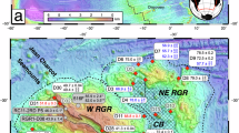Because the lavas of the RGR appear to be unaffected by crustal contamination, we use the rare earth element compositions to estimate the melting conditions of both the tholeiitic and alkaline magmatic phases of the RGR. We applied the REEBOX Pro (v.1) melting algorithm from Brown and Lesher38, which calculates the trace element compositions of pooled melts over a range of pressures between the mantle solidus and the base of the rigid lithosphere. Due to the retention of the HREE relative to the middle rare earth element (MREE) in residual garnet, ratios of these elements reflect changes in the depth of melting39,40. The latter depends on the composition and temperature of the upwelling mantle which defines the depth of solidus intersection and thus the beginning of partial melting. The degree of melting is controlled by the length of the melting column which is limited by the thickness of the overlying lithosphere, and also increases with increasing mantle temperature. Since the MREE are less incompatible than the LREE in mantle minerals, higher ratios of LREE/MREE reflect a lower degree of melting39,40. Subsequent fractional crystallization has little effect on the ratios of rare earth elements or other highly incompatible elements used in the modelling.