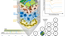 The leftmost bracket on the right-hand side represents the number of individuals escaping starvation (death due to insufficient environmental substance) at the previous time-step and \({G}_{q,j}\left(t\right)\) is the per capita reproductive growth rate. \({{{{{{\rm{{\Upsilon }}}}}}}}_{q,j}\left(t\right)\) gives the number of mutant offspring individuals produced during reproduction from parent individuals of genotype \(j\). \({{{{{{\rm{{\Upsilon }}}}}}}}_{q,x\ne j}\left(t\right)\) represents the number of \(j\) genotype individuals derived from mutation in parent individuals of other genotypes. \({\delta }_{q,j}\left(t\right)\) is the number of individuals of genotype \(j\) lost to random death, and the rightmost bracket relates the total number \({S}_{q}\left(t\right)\) of individuals of species \(q\) to carrying capacity \(K\), which represents limitation of growth by any factor other than the relevant environmental substance, e.g. space. (The steady state population size in all simulations shown is below \(K\) and limited by the environmental substance influx. The carrying capacity is included in the model for computational reasons and as a “crash preventer” but has no qualitative effect on the results).