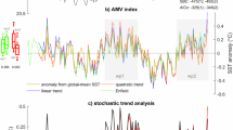 The reconstructed ΔT and corresponding ΔOHC time series are synthetised in Fig. 2 for four depth layers as zonal averages of the section from the Florida Strait to Africa (Fig. 1) after the Green’s functions have been further constrained by a Bayesian adjustment to observations (‘Methods’ and Supplementary Fig. 2). The small ΔOHC observed at the beginning of our time series is attributed to the long pivotal period with no climate trend situated after the end of the Little Ice Age (Fig. 2a) and before the onset of the modern period of increasing anthropogenic forcing of global mean surface temperature37,38. Then the different depth layers deviate from this plateau. For the 0–700 m layer, where rapid (~5 years, Supplementary Fig. 3) ocean response to SST change occurs, ΔT evolution broadly reflects the North Atlantic SST (Fig. 2a, c) showing a prevalence of the Atlantic Multidecadal Oscillation until the 1970s, after which the accelerating greenhouse warming dominates39. The main ΔT trends of the layer can be directly associated with the main climate fluctuations. After a slight recovery from the little ice age cooling, the severe late-nineteenth-century cooling stands out (Fig. 2c, ΔT least-squares trend of −0.085 ± 0.012 °C/decade during 1879–1919). Then, two main periods of warming are observed during the twentieth century: the early-twentieth-century warming (0.068 ± 0.015 °C/decade during 1923–1959, 0.1 ± 0.02 during fast phase 1923–1943) and the late-twentieth-century warming (0.078 ± 0.008 °C/decade, 1975–2007) interrupted by the mid-twentieth-century cooling (−0.138 ± 0.023 °C/decade, 1959–1975). During the early-twenty-first century, a warming acceleration (0.22 ± 0.011 °C/decade) is noticed after a slight 2007–2012 slow-down (0.02 ± 0.023 °C/decade). Below 700 m, the signals are lagged by the longer timescales for transport from the surface source regions to the 25°N section and attenuated by mixing along their paths. For 700–2000 m (Fig. 2d), after initial warming (0.011 ± 0.005 °C/decade), the ΔT time series show two cooling-to-warming reversals: from 1939 an 18 years of cooling (−0.051 ± 004 °C/decade) switching in 1957 to a long warming (0.038 ± 0.002 °C/decade) and from 1997, an intense but brief cooling (−0.127 ± 0.005 °C/decade) switching in 2005 to a warming (0.061 ± 0.005 °C/decade). The 2000–4000 m ΔT evolution (Fig. 2e) is dominated by long-term warming from 1940 to 1997 (0.011 ± 0.001 °C/decade) followed by a short 8 years of cooling in 1997–2005 (−0.012 ± 0.001 °C/decade) returning to warming in 2005 (0.012 ± 0.001 °C/decade). The abyssal layer (Fig. 2f) shows a ΔT pattern comparable to that of the 2000-4000 m layer. The trends in the upper ocean mirror the major climate fluctuations in the North Atlantic, and in the lower ocean, signals are of much lower frequency but still show strong variability, the origin of which will be deciphered below in this paper.