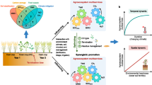 The three improved ecosystem functions under cropland agroforestry, i.e., carbon sequestration, habitat for soil biological activity and wind erosion resistance (Figs. 1–3), all address major global change problems. First, the increases in the trees’ net primary production and combined root density from crops and trees signified that agroforestry performed better in carbon sequestration than open cropland or grassland (Fig. 3). This substantiates projections that European agricultural systems currently sequester less carbon than they potentially could under improved land-use strategies21 including agroforestry22. Although SOC stocks in our ≤9-year-old agroforestry systems did not differ from the open cropland or grassland, other studies in ≥15-year-old alley-cropping agroforestry systems show increases in SOC stocks23. As claimed for temperate agroforestry systems based on a meta-analysis12, we expect that SOC stocks at our sites will also increase as agroforestry ages. Second, the increased population sizes of earthworms, bacteria, and fungi in our cropland agroforestry systems (Fig. 1) support positive effects of agroforestry for biological habitat, as was reported earlier for macro-detritivorous arthropods13, earthworms24, and plant diversity25. This improved habitat for soil biological activity will possibly have positive bottom–up effects on higher trophic levels26. Hence, agroforestry may counter the effect of intensive management in croplands on loss in species abundance27. In grassland agroforestry, however, habitat for soil biological activity remained comparable to that in open grassland (P > 0.05, Supplementary Table 5), which we attribute to the fact that both systems have perennial plants, manifesting permanent roots28 and high plant species diversity29 combined with low fertilizer application at the studied sites30. Third, susceptibility of soil to wind erosion is not only common in Central Europe31 but is a serious global problem32 that reduces SOC, nutrient stocks, and agricultural productivity33,34. The strong reduction of wind speeds to levels below risk of wind erosion (Supplementary Fig. 2c) was a direct result of the introduction of tree rows (Fig. 1), a positive effect that is well known from shelterbelts35. This is a major motivation mentioned by farmers for their acceptance of agroforestry36.