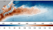 To investigate the potential contribution of the asthenosphere to the observed shallower seafloor depths, we estimate the temperature variation in the asthenosphere using shear wave speeds averaged between 30 and 150 km depth in our published seismic model23, and calculate its effect on seafloor depth assuming that isostatic equilibrium is reached by 150 km depth. Using a near-solidus dT/dVS of 0.5 K m−1) s25, where T is the temperature and VS is the seismic shear velocity, and a moderate thermal expansion coefficient of \(\alpha =3.2\times {10}^{-5}{K}^{-1}\), we find a maximum 70 m uplift of seafloor depth at around 45 km to the west of the JdF Ridge axis (Fig. 5b). This effect is small compared with the observed seafloor depth deviation (Fig. 5c, left part). Increasing the temperature variation or thermal expansion coefficient would help explain the shallow seafloor depth on the western flank, but it would lead to unrealistic greater depths on the eastern flank (Fig. 5c, right part). In addition, the distance trend of the average VS (and the predicted effect on seafloor depth) follows a “U” shape (Fig. 5a, b), which is inconsistent with the approximately flat trend observed in the seafloor depth residual (Fig. 1c). Therefore, we suggest the asthenospheric effect to be secondary to the lithospheric thermal variation near the JdF Ridge, in contrast to the East Pacific Rise, where the seafloor elevation effect of asthenospheric buoyancy was estimated to be around 10 times larger than that of the lithospheric thermal expansion11.