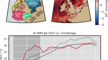 Indeed, June 2023 was the sunniest June since 1957 over the United Kingdom19. ERA5 monthly mean net shortwave radiation confirms June 2023 was unusually sunny over the NWS as a whole (Fig. S8a). Latent heat fluxes were also lower than average (Fig. S8d). June ocean wave activity was the lowest recorded over the shelf in the last 40 years according to the NWS regional wave reanalysis WAVamm15_RAN (Fig. S9a, c), linked with both local (North Sea/NWS) and remote (North Atlantic) weak winds (Fig. S9d).