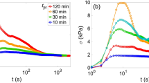 The early crystallization of Fe-Ti oxides could indeed impact the solidification rates for the Mt. Etna melt, resulting in lower values compared to Stromboli melt. This inference is supported by Kolzenburg et al.27, which explores the rheological solidification pattern of Mt. Etna melt under different fO2 conditions. In detail, the authors observed a sudden viscosity increase due to crystallization under reduced fO2, resembling the rheological profiles seen in the Stromboli experiments of this study. Applying the reduced fO2 conditions adopted by Kolzenburg et al.27, MELTS calculations indicated that plagioclase is the first phase to crystallize in the Mt. Etna melt. In contrast, for experiments carried out under air fO2, the authors27 observed an initial slow increase in viscosity, followed by a rapid viscosity rise. Similar trends in viscosity measurements were observed by Di Fiore et al.28. They noted a prolonged region of slow increase of viscosity with increasing \(\dot{\gamma }\) at each q, identifying a characteristic timescale that marked the change in the solidification rate of the crystallizing melt. The first region characterized by lower rate of solidification was attributed to shear-induced crystallization and the second region where the higher rate of solidification was predominantly influenced by the cooling rate (Supplementary Fig. 4). The slow viscosity increase observed by Kolzenburg et al.27 in CDE under air fO2 for the Mt. Etna melt aligns with the shear-induced crystallization regime observed in Di Fiore et al.28. In both melts the first phase to crystallize under air fO2 is the Fe-Ti oxides phase.