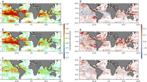 The subsurface weakening in the extratropical regions is most pronounced in the Indo-Pacific basin, whereas the Atlantic basin between 25°N and 40°N experiences an intensification below the mixed layer (Supplementary Fig. 5). As such, changes in the Indo-Pacific basin contribute more substantially to the zonal-mean pattern. To further investigate the geographic pattern of this weakened subsurface seasonality, we assess changes in seasonal amplitude averaged across the 60 m layer below the climatological MLD (see Mixed layer depth in Methods; Fig. 2c and Supplementary Fig. 3b). Negative trends are widespread over most of the extratropical subsurface ocean. In the NH, significant negative trends are evident in the North Pacific poleward of ~20°N and the North Atlantic poleward of ~40°N. In the SH, similar trends are observed between 15°S and 45°S. In contrast, the seasonal amplitude has intensified over large portions of the subsurface tropical ocean, particularly in the central and eastern tropical Pacific.