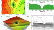 In the northernmost area of mapping (Figs. 1 and 2a), several pockmarks are elongated, and many crescent-shaped pockmarks are also interconnected, indicating the possible effect of erosion. The crescent-shaped pockmarks result from the erosion by currents of the circular pockmarks64,65. Additionally, the seismic sections crossing some of the pockmarks show evidence of erosion with truncation of seismic reflections by the pockmark walls, where the uppermost sediment layer is absent, and the older ones are exposed within the trough of these features (Fig. 3g inset 5). The presence of several pockmark strings (connected pockmarks, Fig. 2a, c, d) indicates the effect of currents and erosion in removing the sediment between pockmarks to create an interconnected string of pockmarks. Many pockmark strings end in a single pockmark much larger than those forming the string3.