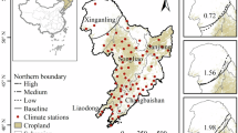 where c is a county index and t is for year (1980–2014). \({\hat{y}}_{c,t}\) is the predicted yield anomaly in county c and year t. \({{TX}}_{c,t}\) and SMc,t represents the detrended maximum temperature and soil moisture values in county c and year t, respectively. β0 represents the regional intercept, β1 and β2 represent the soil moisture regional effect, β3 and β4 represent the maximum temperature regional effect and β5 represents the temperature-soil moisture regional interaction effect. Coefficients with subscript c accommodate different sensitivities for each county per region where the slope is random, with county as random factor. Confidence intervals for regional and county-level coefficients, in addition to yield prediction estimates, are calculated based on bootstrap resampling with 1000 draws. For further robustness tests, we calculate out-of-sample model predictions, including for year 2012, based on a leave-one-out cross-validation scheme and compare the model performance to in-sample model fit.