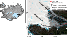 There have been numerous theoretical attempts to establish the characteristics that determine whether a channelized or distributed system will form at soft beds50,51,52. These previous attempts have investigated the relative properties (and importance) of ice, sediment, and ice surface slope. However, we suggest that our results indicate the importance of sediment grain size. The subglacial till at Skálafellsjökull and Fjallsjökull is relatively fine grained (ranging from coarse silt to fine sand) and has a low porosity and transmissivity, which results in the development of the multichannel form and a spatially similar low summer effective pressure pattern. In contrast, at Briksdalsbreen the presence of coarse-grained till (very coarse sand) indicates that at the beginning of the melt season, as the distributed system grows, a low-pressure channel is formed from sediment erosion. This till has a relatively high porosity and transport capacity and so rapidly draws water from the surrounding till, allowing this channel to remain relatively stable52. This results in spatial variation in subglacial till water pressures across the bed, including areas of over pressurization (as described above). A similar situation is found at Breiðamerkurjökull, where the early summer distributed system probably remains up-glacier, but towards the margin develops into a channelised system due to a combination of the coarse till, high discharge and deep proglacial lake.