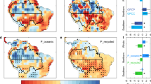 We downloaded and processed CMIP6 simulations28 from the Earth System Grid Federation (https://esgf-ui.ceda.ac.uk/cog/search/cmip6-ceda/). We used the preindustrial control (piControl) and global deforestation (deforest-globe) simulations. The latter is an idealised deforestation experiment whereby 20 million km2 of forest is linearly converted to grassland over a 50-year period (i.e. 0.4 million km2 forest loss per year). For 11 LUMIP models we downloaded precipitation data from the piControl and deforest-globe simulations. Following22, we calculated the precipitation response to deforestation by subtracting the first 30 years of the piControl run from the last 30 years of the deforest-globe run. We also downloaded tree fraction data and calculated the percentage reduction in forest cover. For the two models that did not output tree fraction data (GISS-E2-1-G and MIROC-ES2L), we used the mean tree fraction change across the other nine models to estimate the precipitation change per percentage point of forest loss. We calculated the mean response across models (n = 7) that captured the same sign of rainfall response to the observations (i.e. a reduction in rainfall with forest loss). We used Moderate Resolution Imaging Spectroradiometer (MODIS) Land Cover Type (MCD12Q1) version 6.1 310 downloaded from https://search.earthdata.nasa.gov/ to constrain our analysis to evergreen broadleaf tropical forests in the Amazon and pantropical regions.