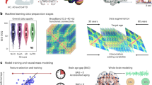 Age estimation models were trained using PCA-derived brain imaging features to predict chronological age. Training and application were performed in the discovery sample using tenfold cross-prediction with 100 repeats. This cross-prediction approach was chosen to maximize precision and avoid bias from external datasets with differing MRI protocols, similar to previous studies15,20,21,22. The discovery sample was split into ten equally sized subsets. In each iteration, nine subsets served for model training and one for testing. PCA was performed on the training data and the transformation parameters were applied to the test set. This procedure was cycled through all ten folds, so each subset served once as the test set. The entire tenfold cross-prediction procedure was repeated 100 times, generating 100 predictions for each individual. This process was run for each tissue type (GM and WM) and model type (RVM, XGBoost tree and XGBoost linear), yielding 600 brain-predicted age estimates per individual (2 tissues × 3 models × 100 repeats). A nested tenfold cross-prediction was used to stack model-type predictions into tissue-specific ensemble estimates for GM and WM. To derive estimates for combined GM and WM, we stacked tissue-specific predictions rather than training new models on combined inputs. This yielded 100 age estimates per tissue type (GM, WM, combined), which were averaged to obtain 1 final brain-predicted age estimate per tissue type. Model performance was evaluated using the product-moment correlation coefficient (r), the coefficient of determination (R2) and MAE100.