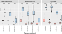 Searching for other potential mechanisms explaining the variability, we note that when normalised to cell volume, the two species G. glutinata and N. pachyderma contain more gene copies than the other three species. Gong et al. (2013) suggested that there could be a positive relationship between SSU rDNA gene copy number in ciliates and the amount of intra individual variability in the gene. Both G. glutinata and N. pachyderma have extensive intragenomic variability in the SSU rDNA gene [26, 44], while G. siphonifera and T. sacculifer do not [24]. This observation points at gene conversion or a similar process occurring during replication that could lead to disproportionately large variability and number of gene copies within individual genomes. Along the similar line, we note that protists genomes are dynamic and undergo important modifications during their individual life cycles of [45]. Foraminifera are multinucleated and heterokaryotic, indicating differential genome multiplication during life, which is episodic [46], thus likely contributing to gene copy number variability per specimen in a way similar as the cell volume size bias due to episodic chamber addition as described above. However, it has also been shown experimentally that food source may influence the nuclear size and DNA content of foraminifera [47], akin to a process by which phytoplankton is able to modify its elemental stoichiometry [48]. Furthermore, prior to reproduction, the nucleus of foraminifera enlarges and DNA and other material condense into granules that are degraded in a process referred as Zerfall [49], allowing the foraminifera to reduce their genome back to the reproductive size [46]. During this process, the number of gene copies is likely modified and “resets” the gene copy number to a state that is independent of cell size. Finally, foraminifera can reproduce sexually or asexually [50, 51]. It results in offspring of different ploidy and likely genome organisation, potentially producing another dimension of variability in gene copy number per individual. We observe that the distribution of gene copy number seems to follow a bimodal distribution in N. pachyderma (Fig. 2) where asexual reproduction has been observed [50], and it could reflect expression of the diploid and haploid phases.