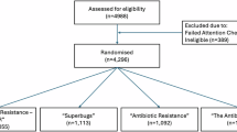 We also measured nine control variables. These included six frequently used demographic variables, one of which was continuous (age), while the others were coded as dichotomous variables for ease of analysis: sex (male = 1, female = 0), first language (English = 1, other = 0), race (white = 1, other = 0), education (university educated = 1, non-university educated = 0), work industry (healthcare = 1, other = 0). Two variables pertained to the participants’ medical history, which had a potential bearing on antibiotic knowledge. “Doctors visits” contained the levels “yes = 1”, confirming that the participant had visited a doctor at least once over the past year, and “no/unknown = 0”, indicating the opposite. The variable “antibiotics taken” contained the levels “yes = 1”, indicating that a participant had taken antibiotics over the past year, and “no/unknown = 0” indicating the opposite. Finally, a Wechsler Adult Intelligence Scale (WAIS) vocabulary score was calculated for each participant, because previous research showed that cognitive abilities such as reading skills affected word memory39. The score consisted of interval data ranging from 0–50.